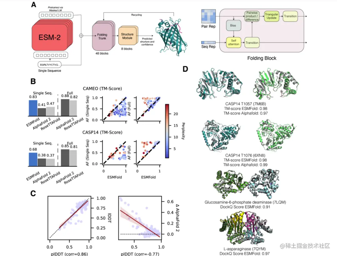 ESM Fold 是一个预测蛋白质序列的模型, 能够直接进行高准确度、端对端、原子层级结构预测。它仅使用单个输入序列,只需查看单个蛋白质序列,这极大加快了推理速度。