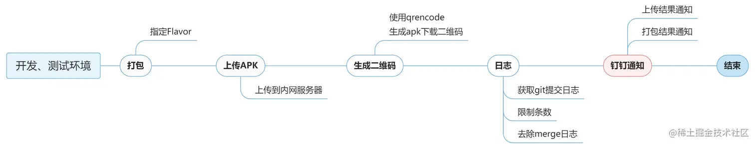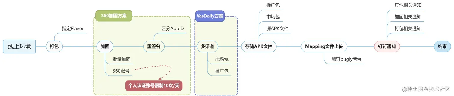 在面向海外的项目组辛勤耕耘了两年,今年被调到了国内的开发组,很多东西突然感觉有些陌生了起来。首先接到的第一个任务就是打包自动化的工作,因为国内的项目组目前有多个app在同时开发,提测的时候人工打完测试包上传到三方平台,然后发送钉钉通知告知测试人员。到生产环境的时还需要打包、加固、重签名,再处理多渠道问题,最后还需要手动上传mapping文件到Bugly等平台,整个一套流程够复杂,并且也相当浪费时间,多个app处理起来更是繁琐。