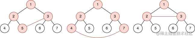 解释:上图是一棵有 23 - 1 个节点的树。红色节点表示添加额外边后形成环的节点。