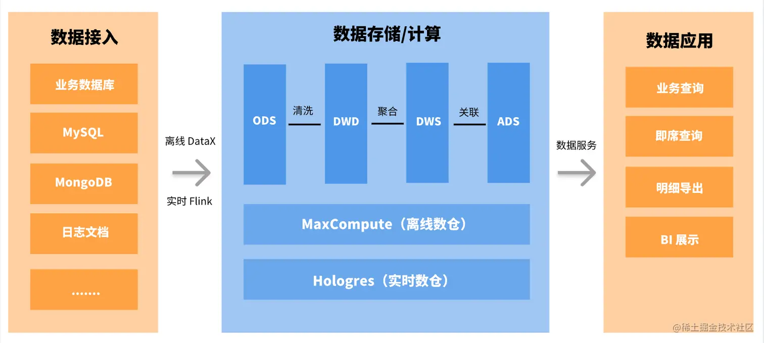 数仓架构 2.0 版本是基于 MaxCompute + Hologres/MySQL 来搭建的。数据来源主要有 MySQL 和 MongoDB 的业务数据以及埋点日志数据;数据首先采集到数据总线 DataHub 中,后经过 DataHub 直接导入到 MaxCompute,MaxCompute 作为一个离线数仓,我们将其进行了传统的数仓分层;数据的加工处理和分析计算主要在离线数仓中进行,并将计算好的结果导出到 MySQL中,来对接 QuickBI 展示报表。此外,我们还尝试了将 Hologres 用作实时数仓,作为 MongoDB 的替换方案,用于业务上的查询系统。
