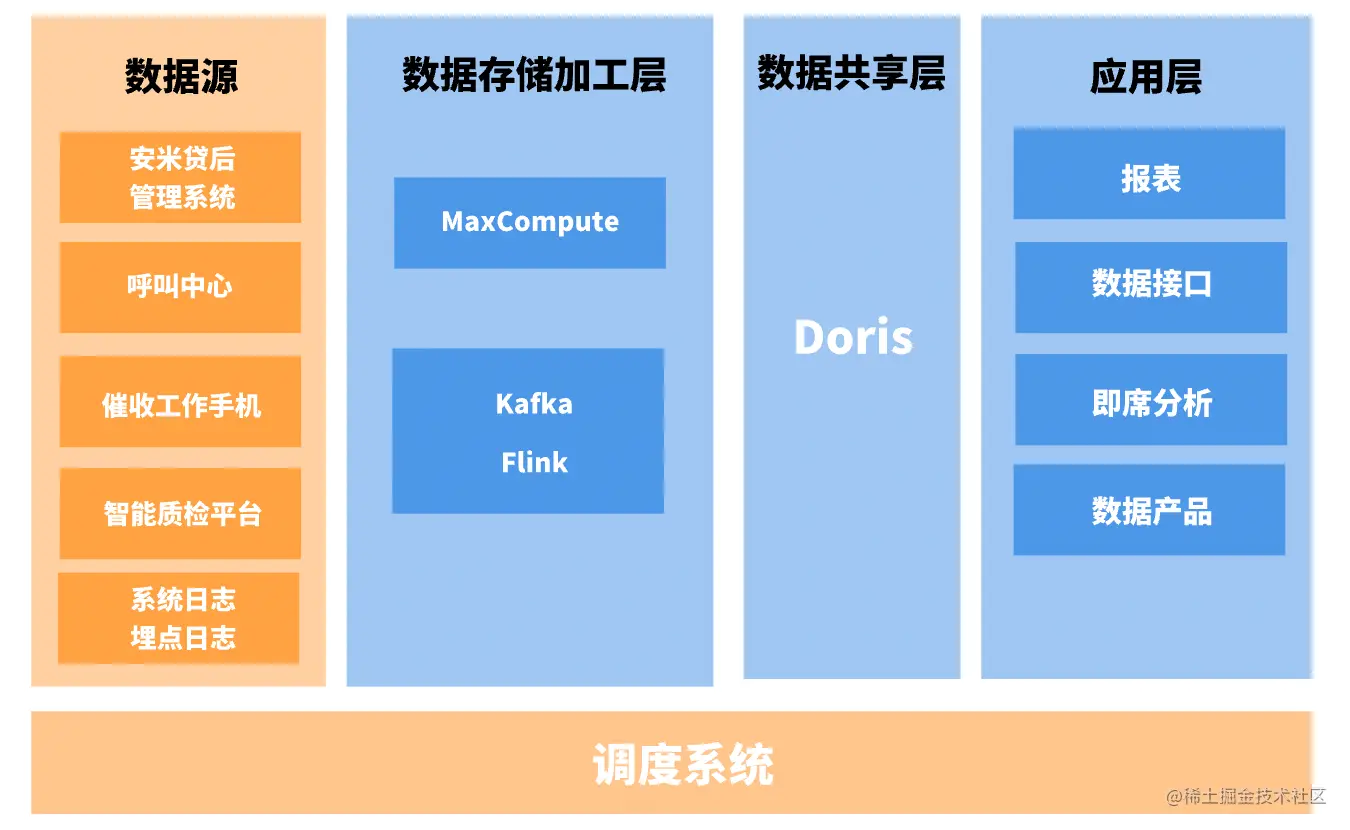 - 使用 Flink-Doris-Connector 进行实时导入:主要用于业务数据的导入,基于MySQL 的 Binlog 日志写入到 Kafka 后,通过 Flink 解析加工后准实时写入 Doris。