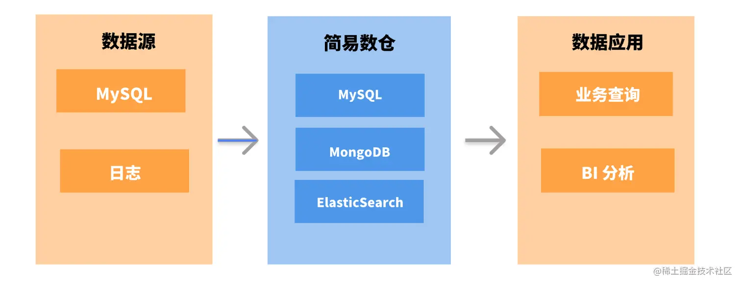 初创期间,由于公司业务量相对较少,主要还是以 OLTP 业务和少量的业务报表服务为主,并且对于数据分析方面的需求也很少,仅通过传统的数据库基本就能满足早期的业务数据需求。数仓 架构 1.0 如下图所示: