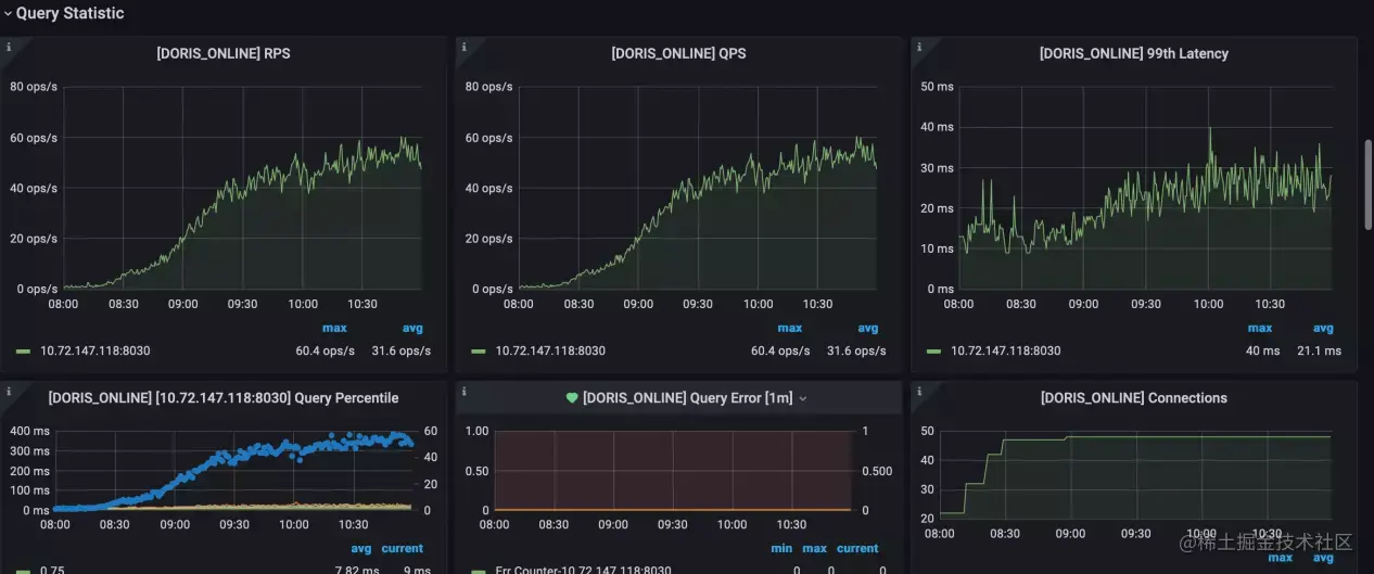 我们使用官网推荐的 Prometheus 和 Grafana 进行监控项的采集和展示,Doris 本身提供了丰富的监控指标和标准监控模版,可以非常便捷地对 Doris 集群使用情况进行监控和报警。