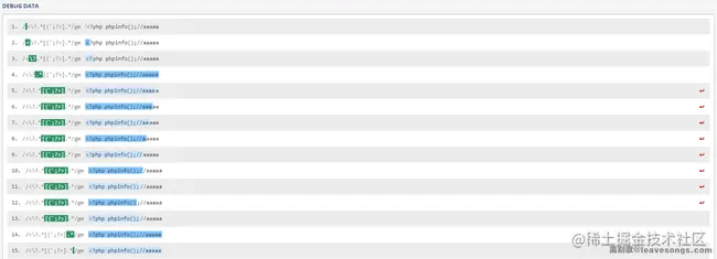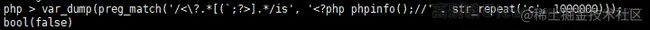 所以,我们题目中的正则<?.[(;?>].,假设匹配的输入是<?php phpinfo();//aaaaa`,实际执行流程是这样的:
