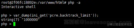 PHP为了防止正则表达式的拒绝服务攻击(reDOS),给pcre设定了一个回溯次数上限pcre.backtrack_limit。我们可以通过var_dump(ini_get('pcre.backtrack_limit'));的方式查看当前环境下的上限:
