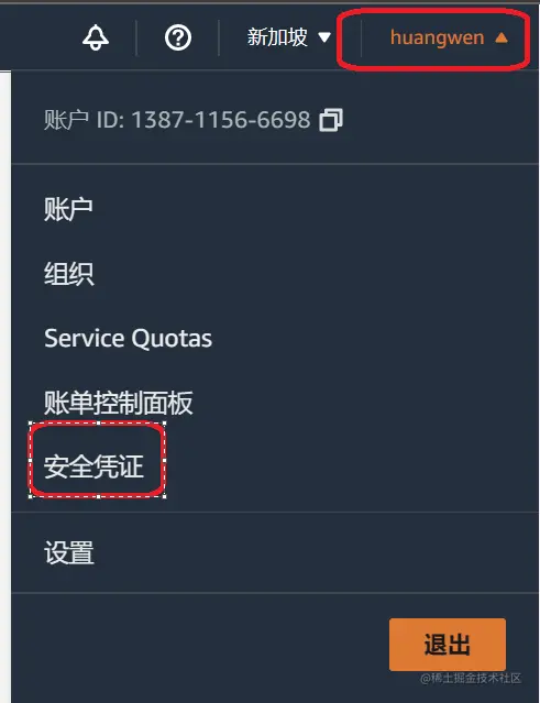 登录亚马逊云科技的官网,点击创建亚马逊云科技账号进行注册,Amazon Console - Signup (amazon.com),注册好根账号后,登录到 Amazon Console,然后点击右上角账号名下拉,选择安全凭证,打开安装凭证设置页面。