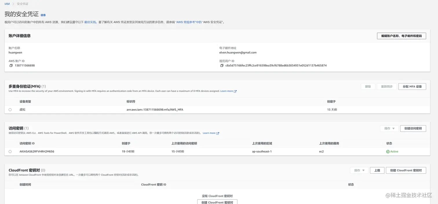 在这里可以设置 MFA,还有访问秘钥,我们创建一个访问秘钥,并下载这个秘钥 rootkey.csv 保存备用。