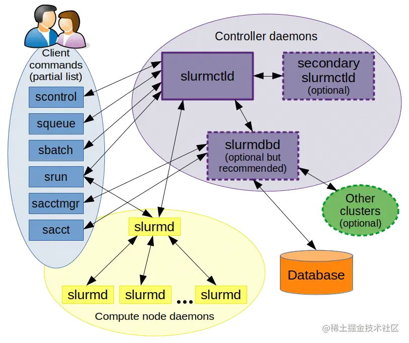 Slurm 的结构图如下所示,它采用 slurmctld 服务(守护进程)作为中心管理器用于监测资源和作业,为了提高可用性,还可以配置另一个备份冗余管理器。各计算节点需启动 slurmd 守护进程,以便被用于作为远程 shell 使用:等待作业、执行作业、返回状态、再等待更多作业。slurmdbd(Slurm DataBase Daemon) 数据库守护进程(非必需,建议采用,也可以记录到纯文本中等),可以将多个slurm管理的集群的记账信息记录在同一个数据库中。还可以启用 slurmrestd(Slurm REST API Daemon) 服务(非必需),该服务可以通过 REST API 与 Slurm 进行交互,所有功能都对应的 API。用户工具包含 srun 运行作业、 scancel 终止排队中或运行中的作业、 sinfo 查看系统状态、 squeue 查看作业状态、 sacct 查看运行中或结束了的作业及作业步信息等命令。 sview 命令可以图形化显示系统和作业状态(可含有网络拓扑)。 scontrol 作为管理工具,可以监控、修改集群的配置和状态信息等。用于管理数据库的命令是 sacctmgr ,可认证集群、有效用户、有效记账账户等。