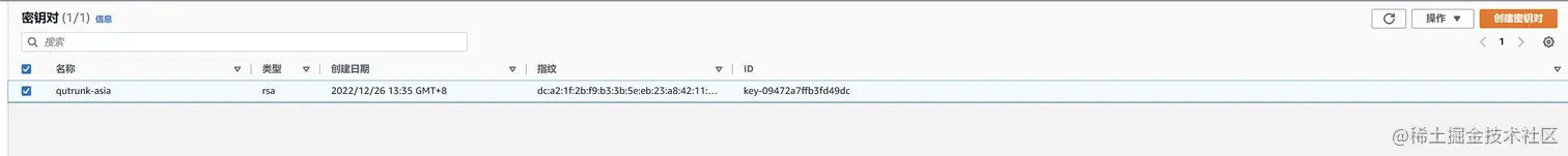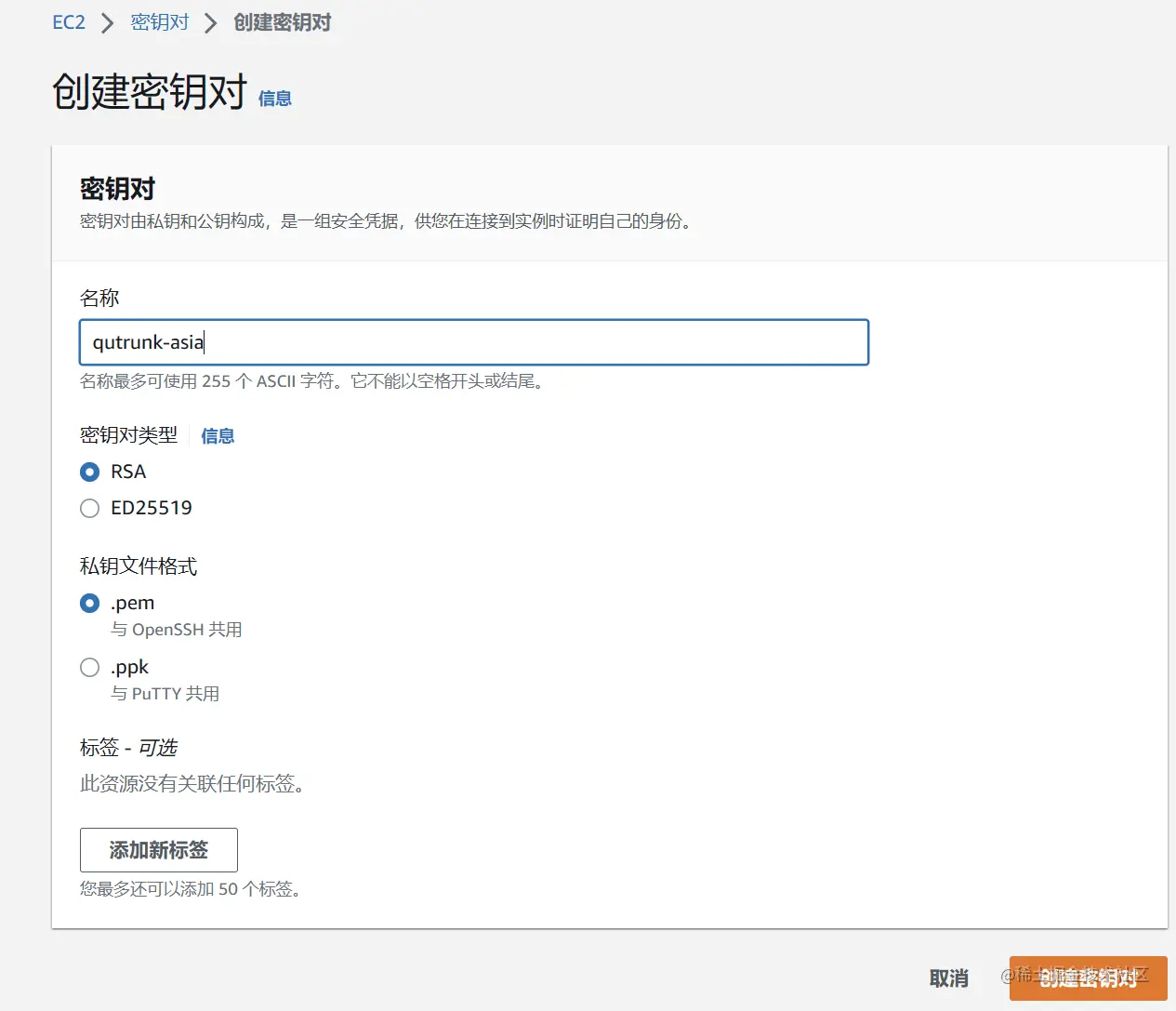 为后面创建的 EC2 服务器登录准备,需要先创建好密钥对,密钥对与 EC2 资源相关,EC2 有 Region 属性,不同 Region 下的 EC2 需要创建不同的秘钥对,本实验中默认将使用新加坡资源,所以在此 Region 环境下的 EC2 服务下的密钥对创建一个密钥对备用。