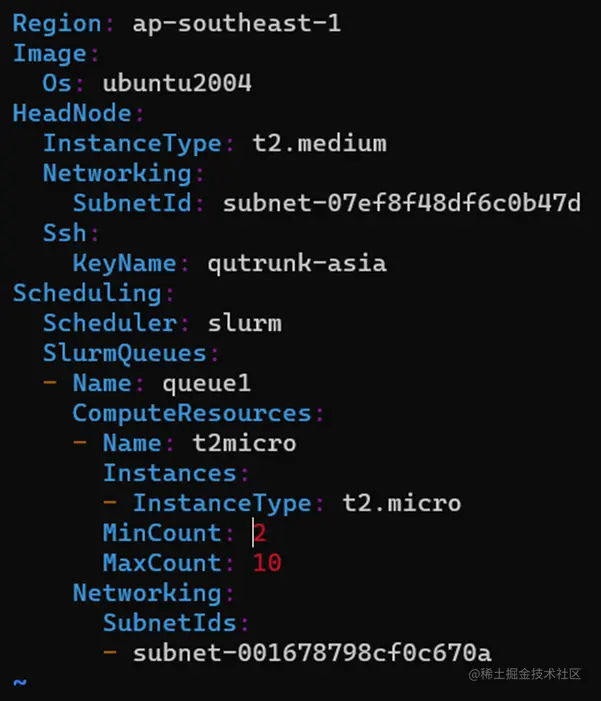 安装好 Amazon CLI 工具之后,我们开始进行集群规划配置,资源分区我们选择亚太新加坡站点:ap-southeast-1,登录 ec2 的密钥对选择提取创建好的密钥对:qutrunk-asia,调度器使用 slurm,操作系统选择 ubunutu20.04 系统,选择创建 vpc,Headnode 节点配置公网 IP。