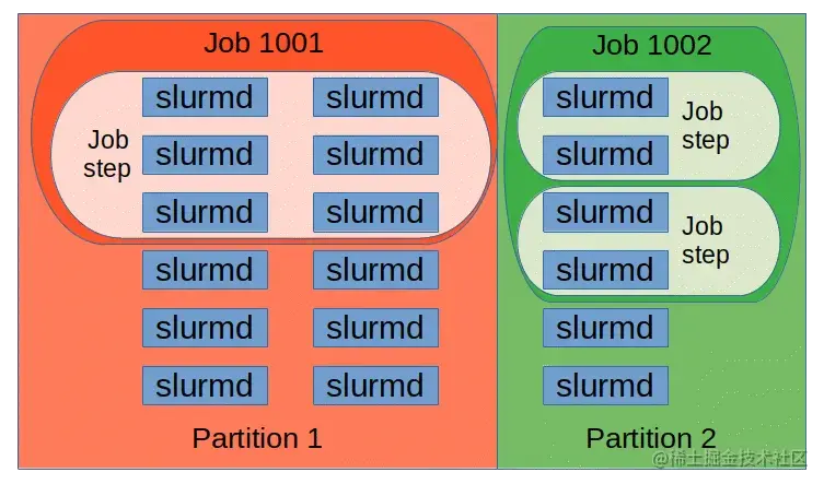 如下图所示,Slurm 守护进程管理的实体包括节点、Slurm 中的计算资源、将节点分组为逻辑(可能重叠)集合的分区、作业或在指定时间内分配给用户的资源分配,以及作业步骤,这些步骤是作业中的一组(可能并行)任务。分区可以被视为作业队列,每个队列都有各种约束,例如作业大小限制、作业时间限制、允许使用它的用户等。优先级排序的作业被分配给分区内的节点,直到该分区内的资源(节点、处理器、内存等)耗尽。一旦作业被分配了一组节点,用户就可以在分配中的任何配置中以作业步骤的形式启动并行工作。例如,可以启动单个作业步骤,该步骤利用分配给该作业的所有节点,或者多个作业步骤可以独立地使用分配的一部分。
