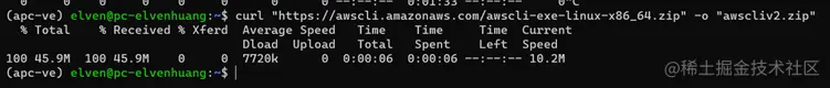 (apc-ve)elven@pc-elvenhuang:~$ curl "https://awscli.amazonaws.com/awscli-exe-linux-x86_64.zip" -o "awscliv2.zip"
