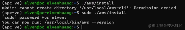 (apc-ve)elven@pc-elvenhuang:~$ sudo ./aws/install