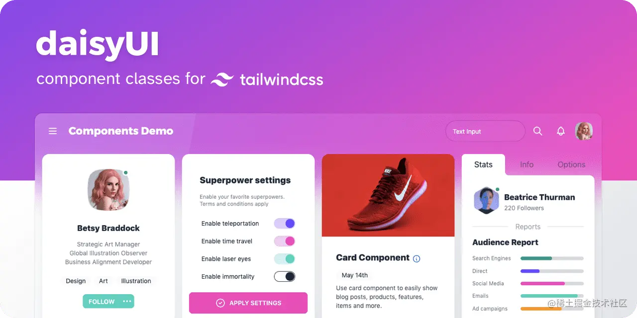 11、daisyui:一款极为流行的 Tailwind CSS 组件库。作为当下最流行的 Tailwind CSS 组件库,具有高颜值、更纯净的 HTML、深度自定义等特点。