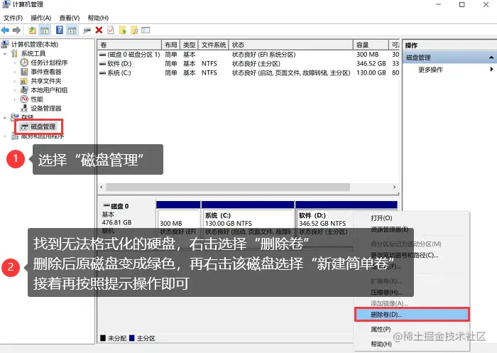 步骤2: 在打开的窗口左侧,找到【磁盘管理】并单击它。之后在右侧找到你要格式化的磁盘,右键选择【删除卷】;