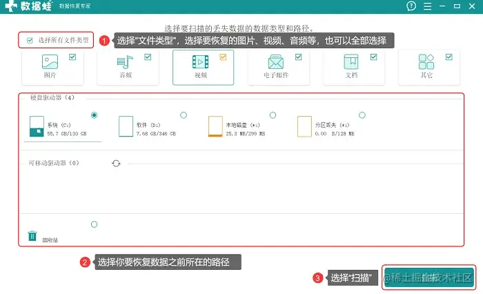 步骤1: 打开该软件,选择所有的文件类型,接着选择文件所丢失的磁盘。选择完成,就可以开始【扫描】了。