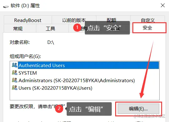 步骤2: 在打开的窗口,切换到【安全】页面,再点击【编辑】;