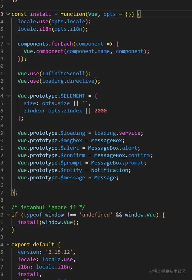 例如在 element-ui 中我们可以看到,作者定义了一个 install 方法并导出。install 方法中将所有的组件都注册为全局组件,且在 vue 原型上挂载了一些方法如 aleart 等。由此我们也可以理解,使用 element-ui 时为什么可以全局使用组件以及原型上的方法使用。