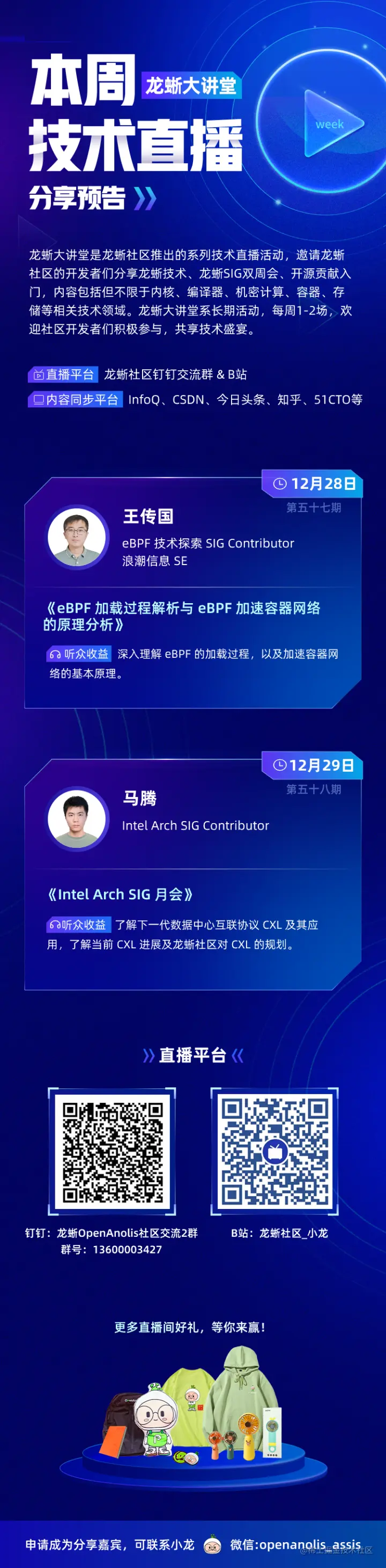 本周「龙蜥大讲堂」预告来啦!龙蜥社区邀请了浪潮信息 SE、eBPF 技术探索 SIG Contributor 王传国,Intel Arch SIG Contributor 马腾做本周主题分享,快来扫码入群,预定前排小板凳观看直播!