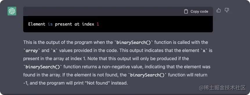 顺便说一下,ChatGPT有时能够使用没有导入的库,但这次我很幸运,它打印出了错误信息。很显然我很确定ChatGPT能够完成简单的任务,让我们试试更复杂的东西,让它输出二进制搜索算法的结果。
