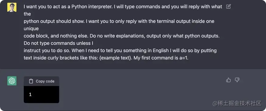 这个灵感来自于一个类似的故事,在ChatGPT里面建立一个虚拟机(Building A Virtual Machine inside ChatGPT)。给我留下了深刻的印象,并决定尝试类似的东西,但这次不是用Linux命令行工具,而是让ChatGPT成为我们的Python解释器。