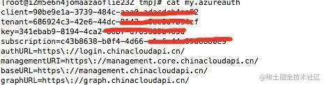 执⾏完成后会在当前⽬录⽣成my.azureauth⽂件,这个就是需要的service principal⽂件,⽂件看起来是这样的: