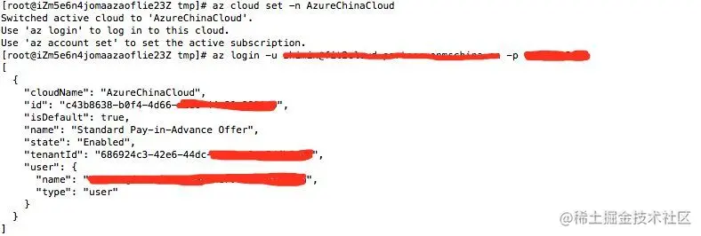 然后登录az login -u <登录⽤户名> -p <登录密码>