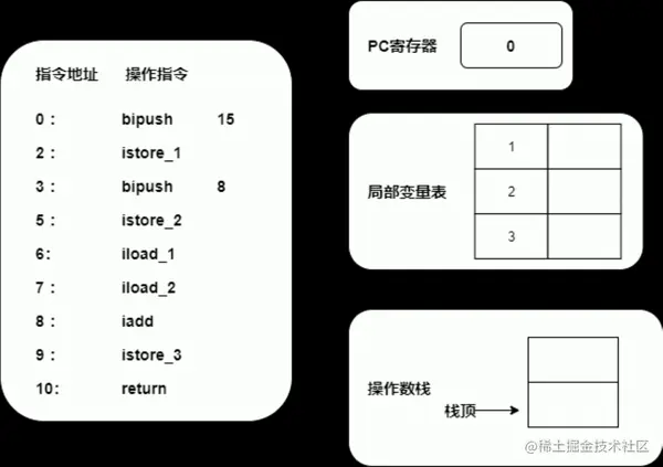 0存放到PC寄存器中,此时,局部变量表和操作数栈的数据为空; - 当执行第一条指令
