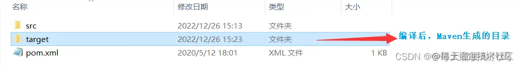 (2)执行mvn compile, 结果是在项目的根目录下生成target目录(结果目录),maven编译的java程序,最后的class文件都放在target目录中!