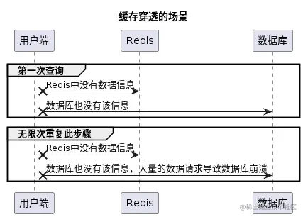 如果是缓存穿透的场景,比如传一个用户 id 为-1,这个用户 id 在缓存里面是肯定不存在的,因为每次请求数据库中也没有对应的数据信息,那么数据库也就不会同步到缓存(Redis)中,所以就会导致,每一次的请求,都会直接打到数据库上,导致数据库崩溃。