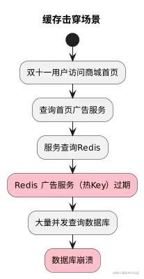 但是假设在这个过程中,这个广告服务的 key 过期,即这个缓存失效了,那么就会有大量的并发请求直接打到数据库中,导致数据库崩溃。