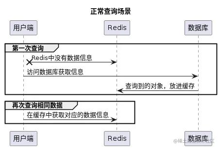 在正常的请求过程中,如果在缓存(Redis)中没有查到信息,则直接向数据库进行查询,查询到之后,数据库会讲数据信息同步到缓存(Redis)中,以便下次查询。
