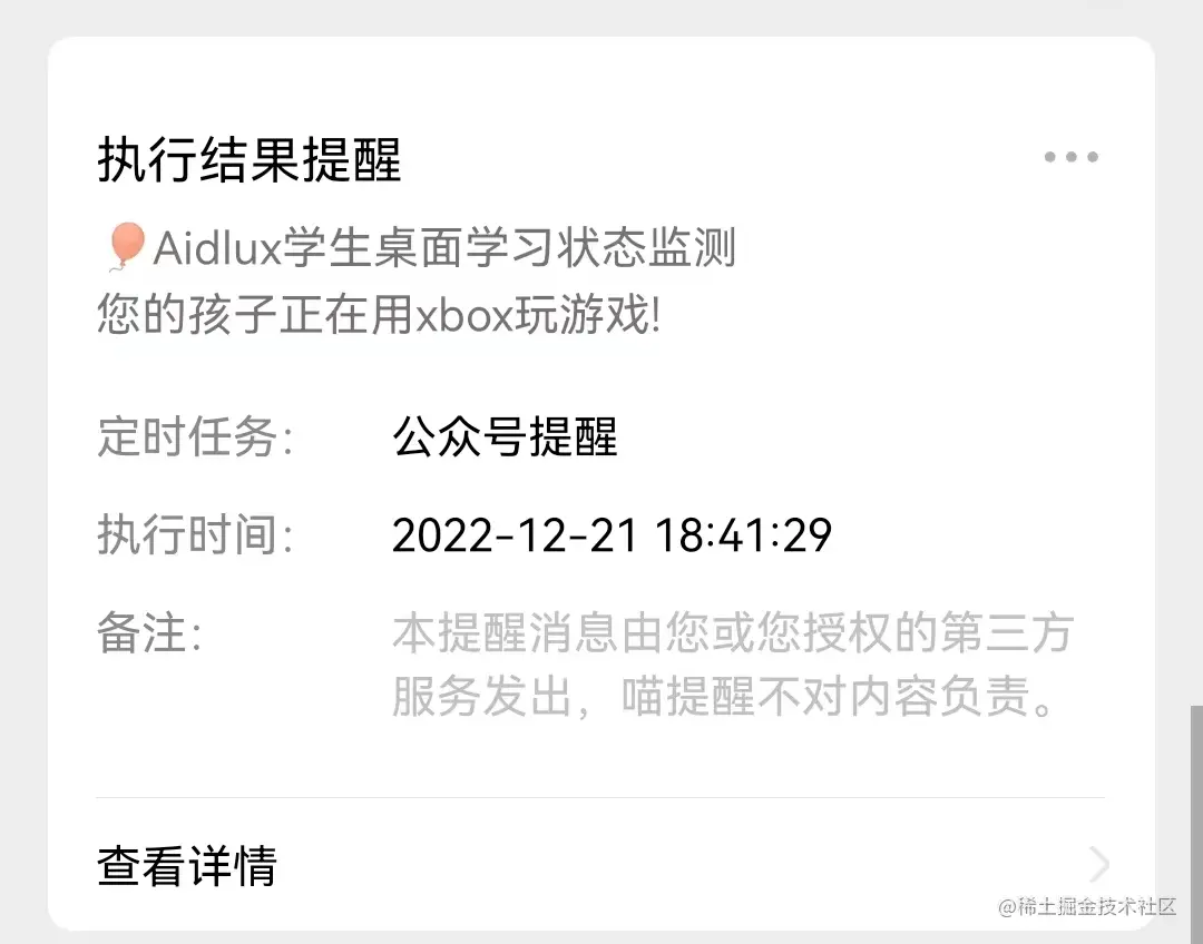 当我们的桌面级监测系统检测到笔和鼠标时,说明孩子在正常的进行网课学习。当监测到手柄时,我们希望系统向家长的手机发送告警信息,此项功能我们使用喵提醒公众号来实现。