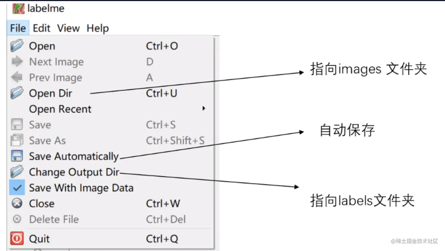 唤起labelme图像界面之后,单击左上角的file,我们需要对其进行一些设置: