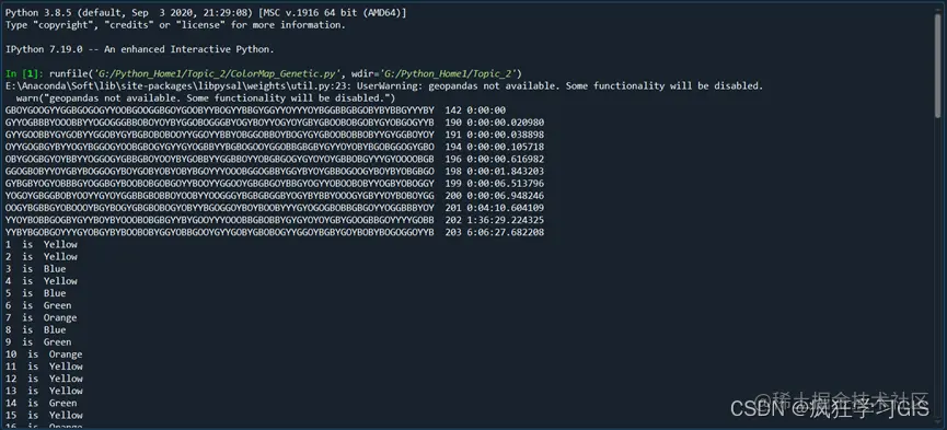 可以看到,通过203次迭代,找到了满足要求的地图配色方案,用时06小时06分钟;代码执行结果除显示出具体个体的整体基因型之外,还将分别显示78个小区域(小图斑)各自的具体颜色名称(我上面那幅图没有截全,实际上是78个小区域的颜色都会输出的)。