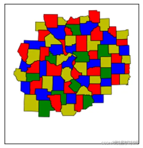 我们需要找到一种由4种颜色组成的配色方案,对该矢量图层各图斑进行着色,使得各相邻小图斑间的颜色不一致,如下图所示。
