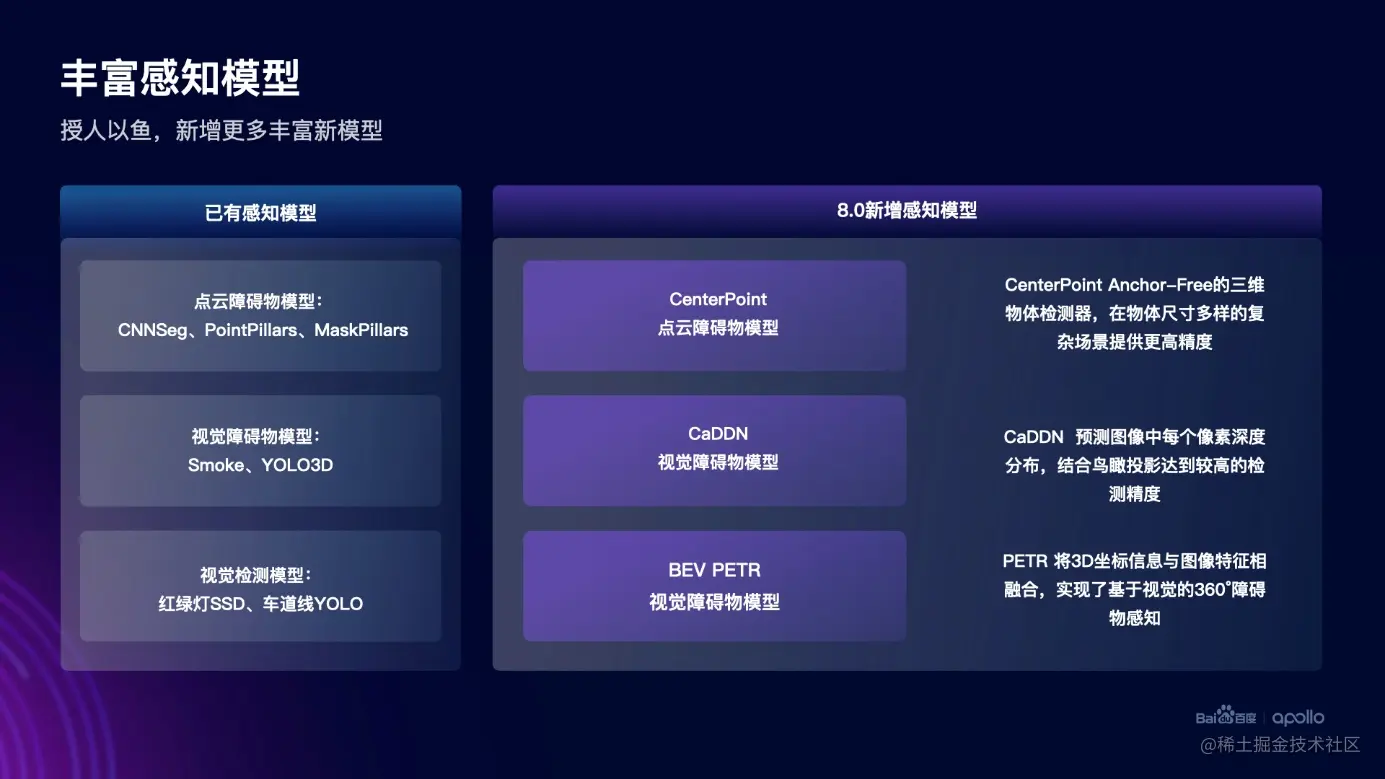 一方面,Apollo开放平台8.0在原有基础上引入了3个新的感知模型,下面的图片上可以很清楚地看到,分别是CenterPoint激光点云障碍物识别模型、CaDDN视觉障碍物识别模型和视觉BEV感知模型PETR。自动驾驶区别于传统的纯软件开发,需要通过硬件的感知能力识别障碍物,Apollo开放平台8.0不再需要认为的设定Anchor的尺寸,而是基于关键点检测的方式回归物体的尺寸、方向和速度,在物体尺寸多样的复杂场景提供更高精度。并且在速度和精度上取得了很好的平衡