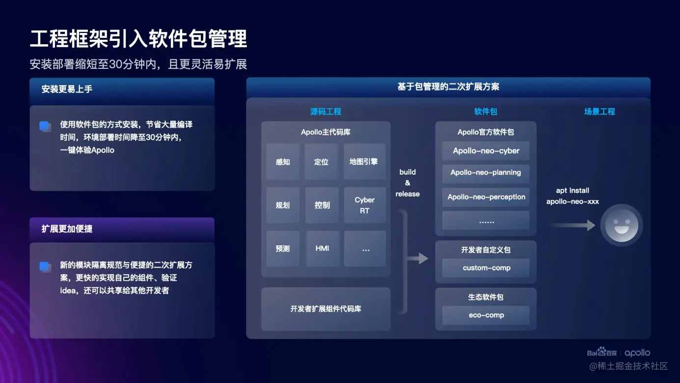 对于开发者来说,每个编程语言的使用和开发,都离不开第三方包的支持,比如Node.js生态中的npm,Java生态中的Maven,通过统一的包管理机制把众多的开发者聚集在一起,极大的提高了代码的复用性和开发效率,Apollo也不例外,8.0在工程框架上引入了软件包的管理,解决了之前项目发布耦合禁的问题,通过软件包的安装方式,节省了大量的编译时间,把环境部署的时间从一天缩短到半小时以内,极大地提高了开发者上手体验Apollo开放平台的效率