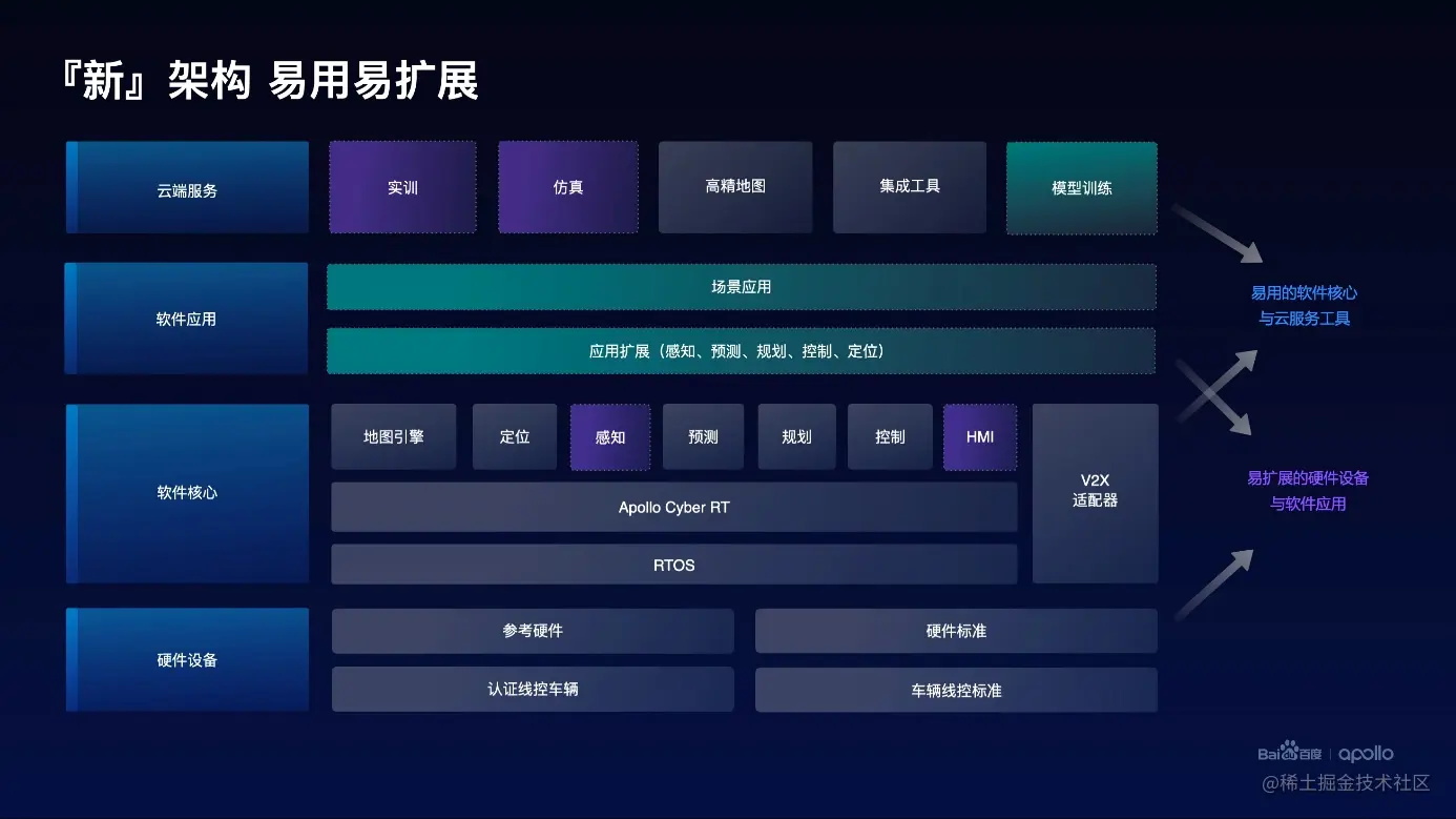 其实在新的四层架构当中,我最想说的还是两个软件层的变化,尤其是软件核心这一层。可以看出来,现在的软件核心层整体开放性大大提升了,除了为开发者提供最为基础的地图引擎、定位这些核心之外,更重要的是从模型测试的感知、预测、规划到控制等各个流程,都是开发者可以触及到的,这也是整个Apollo开放平台8.0易用性提高比较关键的一点所在。