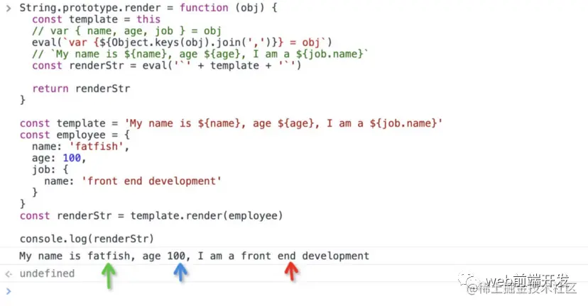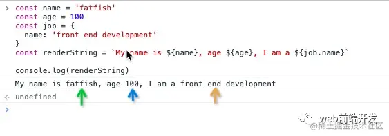 console.log(renderStr) // My name is fatfish, age 100, I am a front end development1.2.3.4.5.6.7.8.9.10.11.