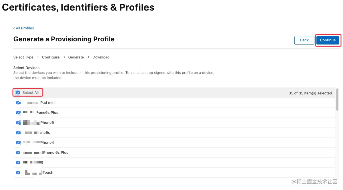选择授权调试设备,这里建议直接勾选 “Select All”,点击 “Continue”: