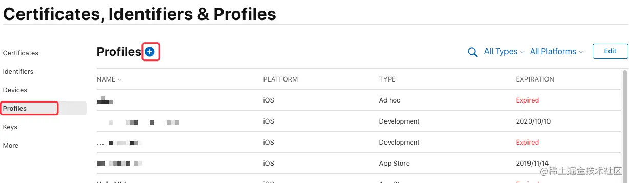 在证书管理页面选择 “Profiles”,可查看到已申请的所有描述文件,点击页面上的加号来添加一个新的描述文件: