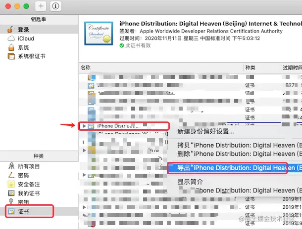 同样双击保存到本地的 ios_production.cer 文件将证书导入到 “钥匙串访问”工具中,可以在证书列表中看到刚刚导入的证书,接下来需要导出 .p12 证书文件,选中导入的证书,右键选择 “导出...”: