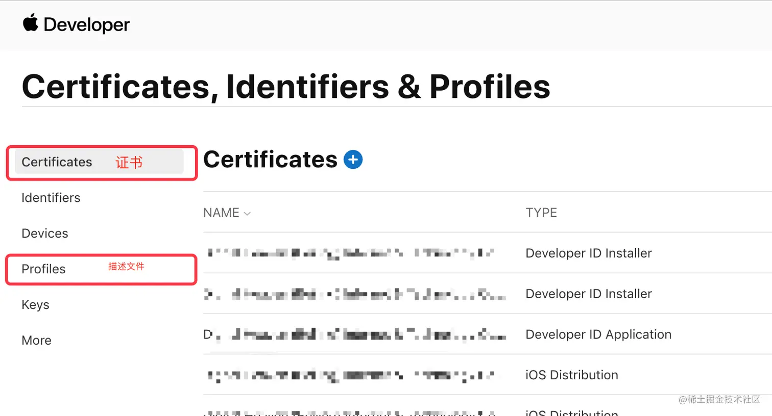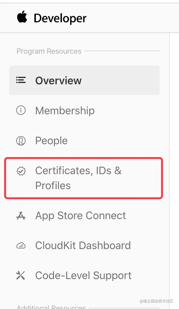 登录成功后在页面左侧选择 “Certificates,IDs & Profiles” 进入证书管理页面:
