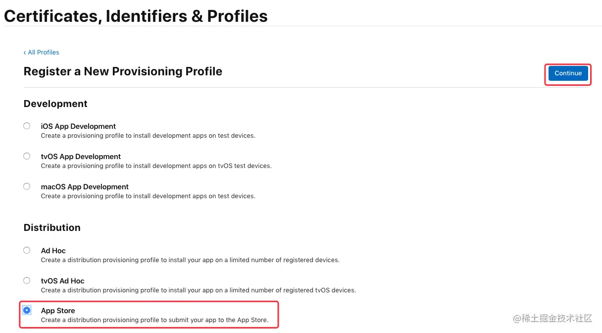 在 “Distribution” 栏下选中 “App Store”,点击“Continue”按钮: