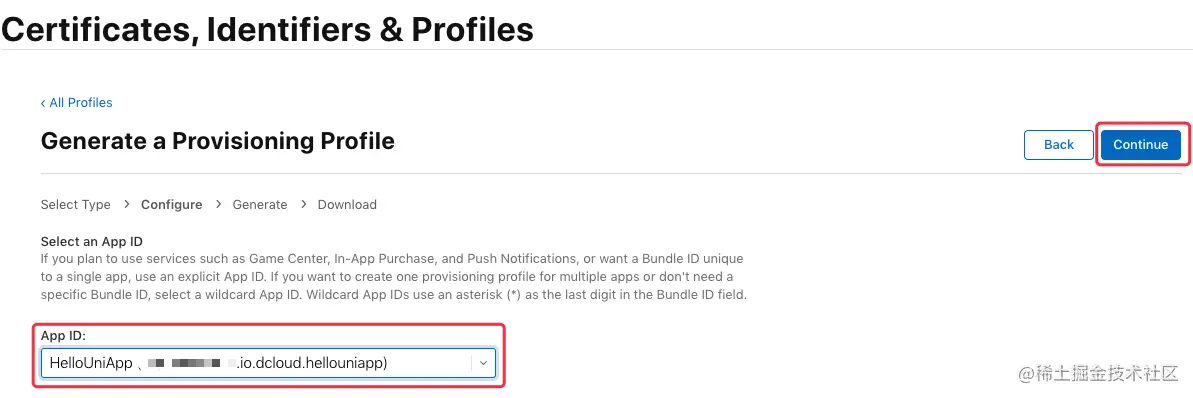 这里要选择之前创建的 “App ID” (这里是“io.dcloud.hellouniapp”),点击“Continue”: