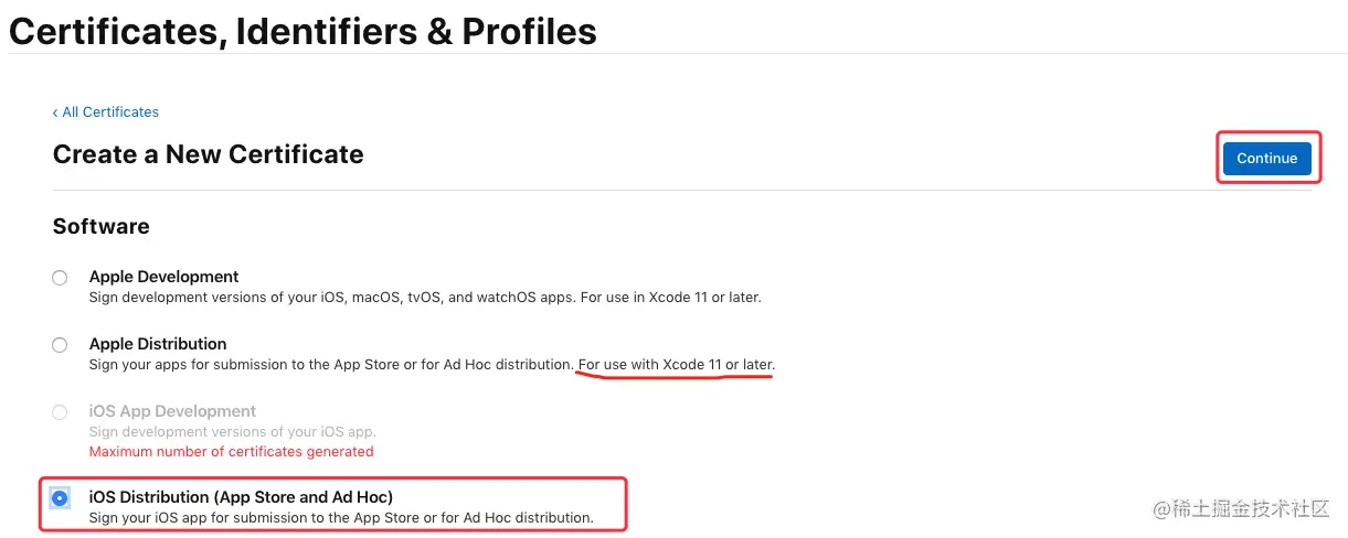 在 “Software” 栏下选中 “App Store and Ad Hoc”,点击 “Continue”: