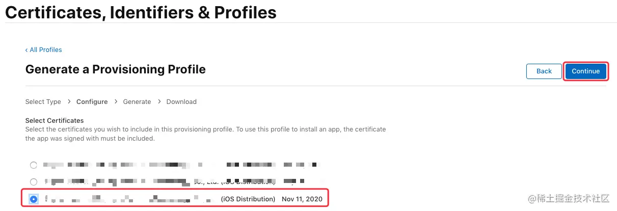 接下来选择需要绑定的发布证书(iOS Distribution),这里勾选刚刚生成的发布证书”,点击“Continue”: