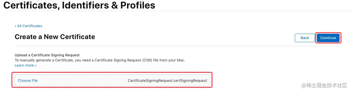 接下来同样需要用到之前生成的证书请求文件,点击“Choose File...”选择刚刚保存到本地的 “CertificateSigningRequest.certSigningRequest”文件,点击 “Continue” 生成证书文件: