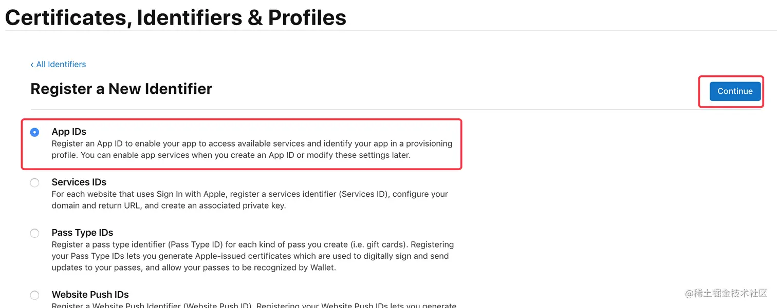 选择标识类型为 “App IDs”,然后点击 “Continue”